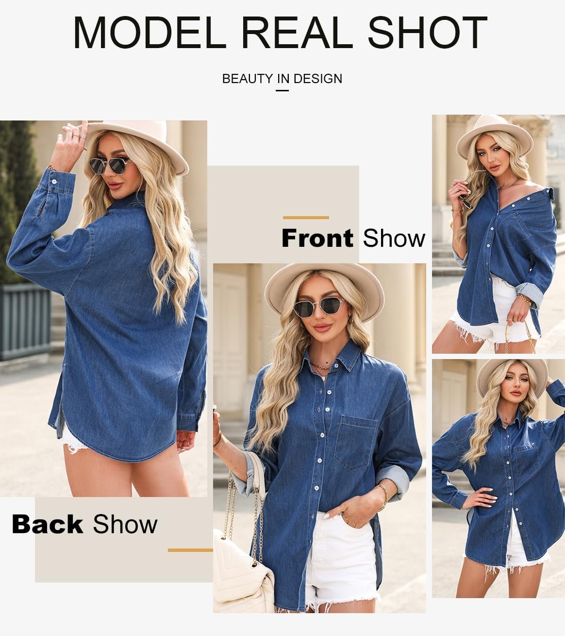 Astylish Women Denim Shirts Button Down Blouse Long Sleeve V Neck Casual Top
