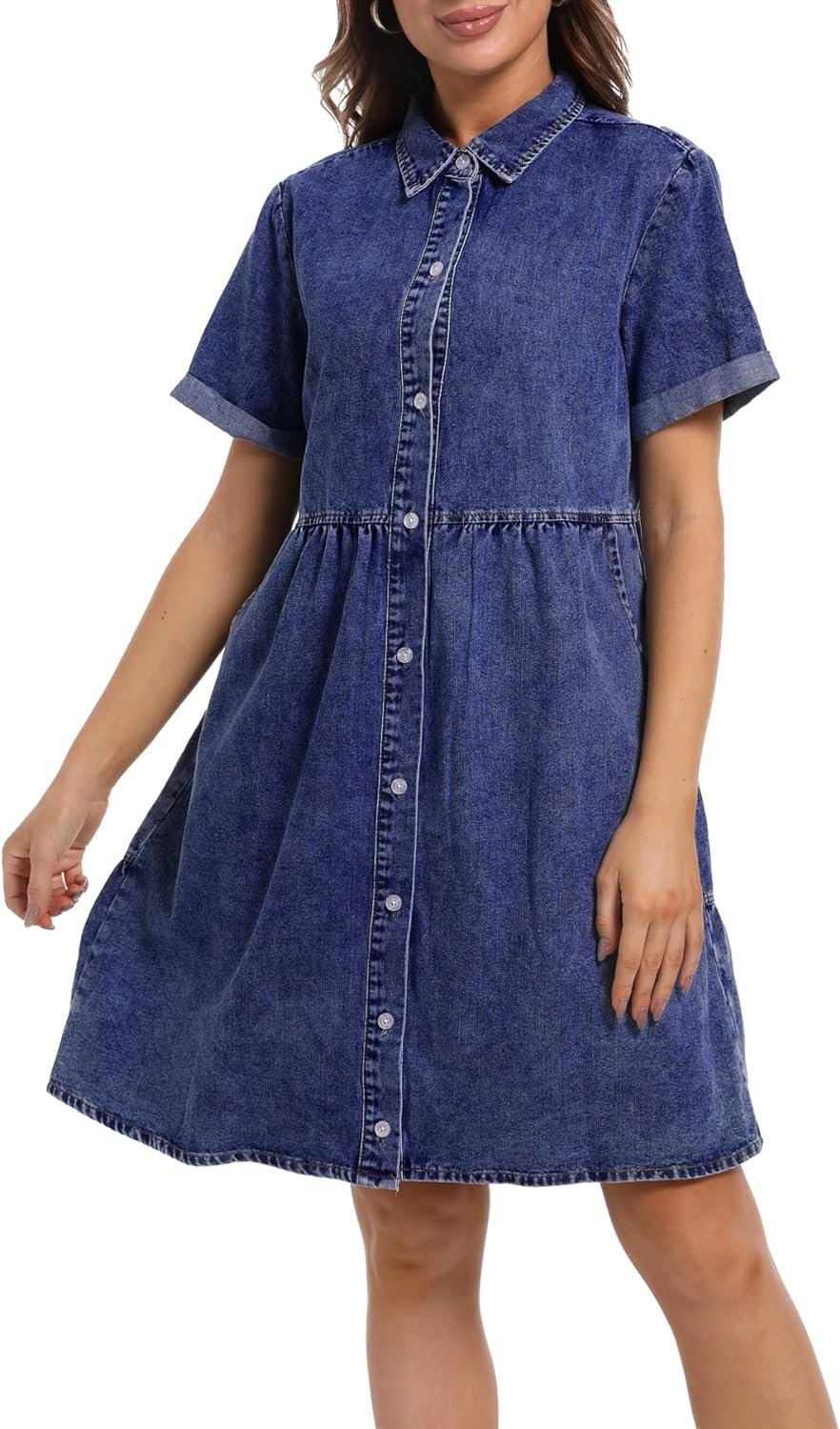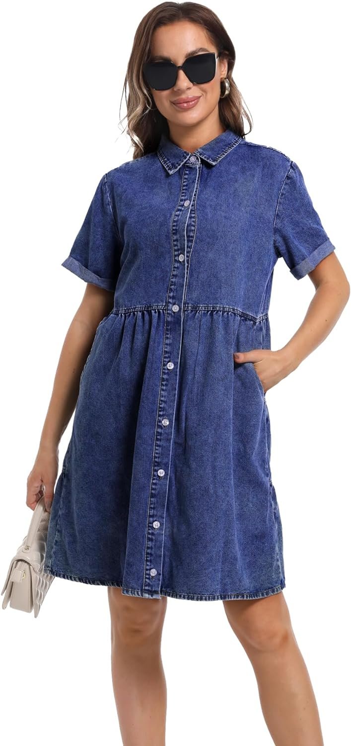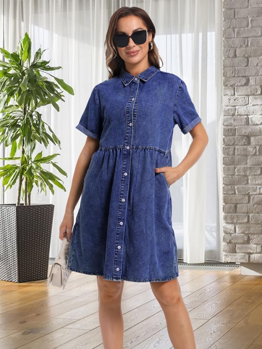 Denim Dress for Women Short Sleeve Button Down Summer Babydoll Casual Jean Dress Tunic Top