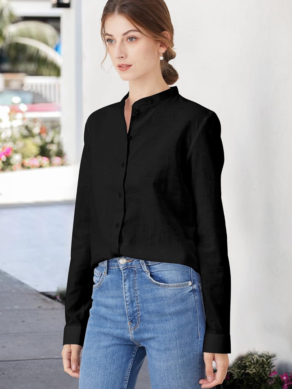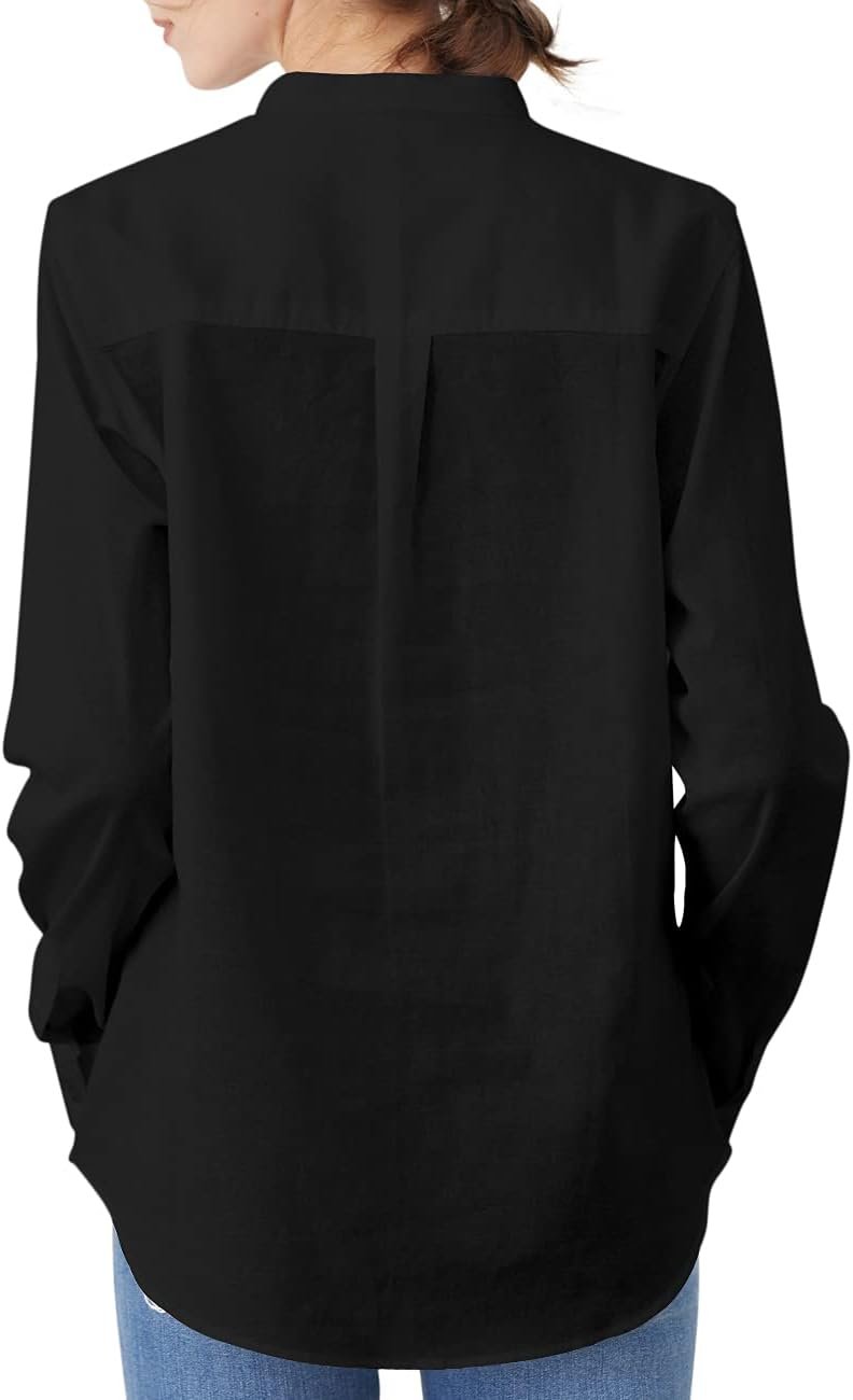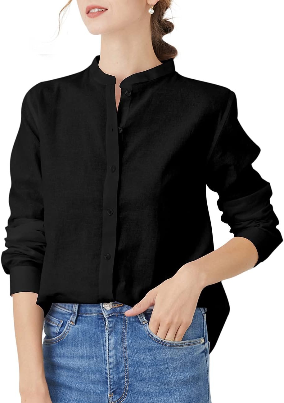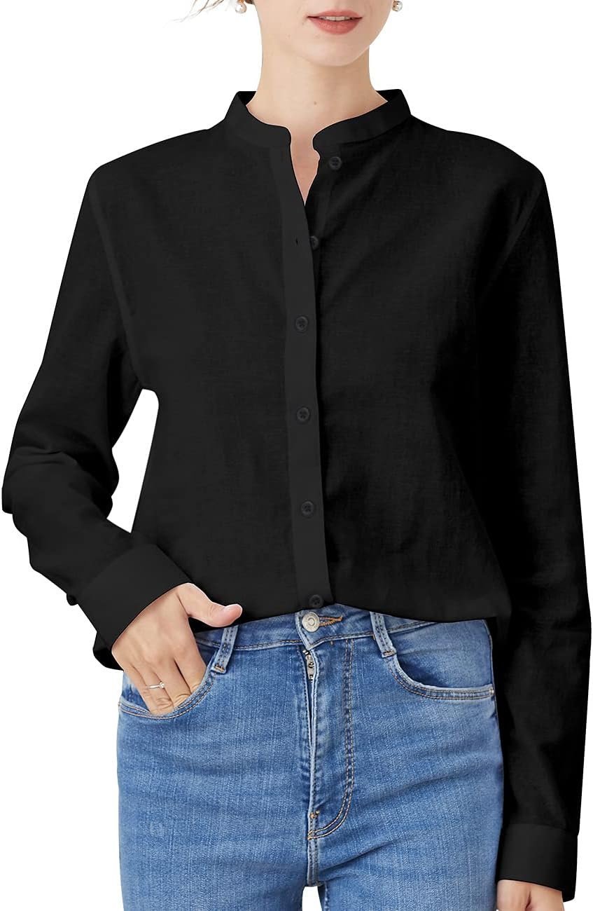 Women’s Mandarin Collar Button-Down Shirts Casual Cotton Linen Long Sleeve Blouses