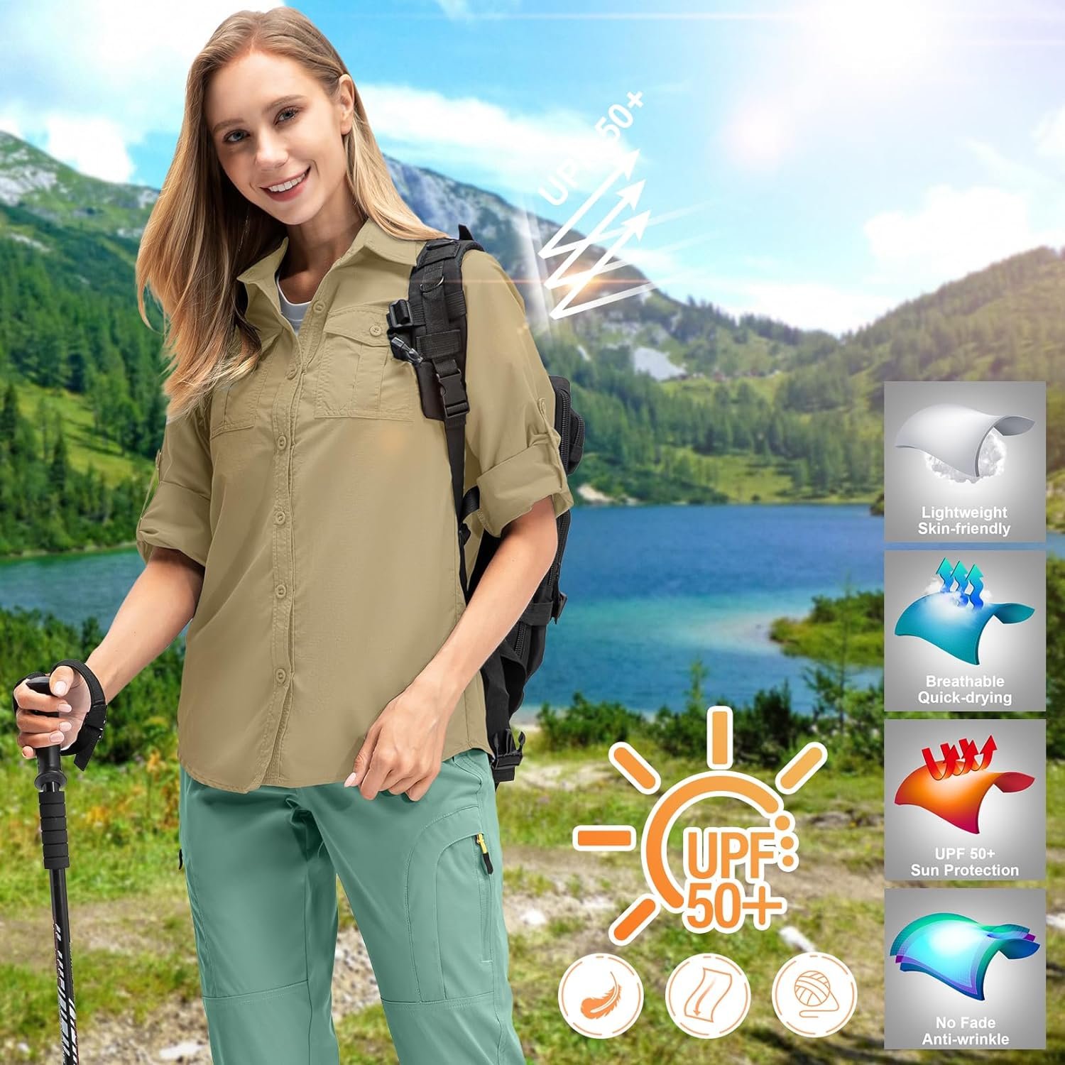 Women’s Quick Dry Sun UV Protection Convertible Long Sleeve Safari Shirts for Hiking Camping Fishing Sailing